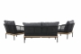 Rammen er udført i sort, pulverlakeret metal og kombineret med smukke detaljer i akacietræ. Ryglæn og sider er flettet i sort polyesterreb, hvilket tilfører et let og luksuriøst udtryk. De medfølgende mørkegrå hynder er tykke og komfortable, og bidrager til en loungeoplevelse, du har lyst til at blive siddende i.