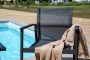 Textilene er UV-behandlet og vandafvisende, hvilket gør det nemt at rengøre og perfekt til udendørs brug. For længere holdbarhed anbefales det at opbevare møblerne tørt eller under overtræk uden for sæsonen.