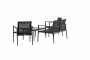 Sættet består af en to-personers sofa, to stole og et lavt sofabord med glasplade. Møblerne har en sort aluminiumsramme og siddeflader i holdbart textilene – et syntetisk, PVC-behandlet materiale, der både er UV- og vandresistent. Det giver sættet en lang levetid og gør det velegnet til det danske sommervejr.